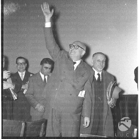Nenni con la mano alzata in segno di saluto e al suo fianco Basso. Piano americano