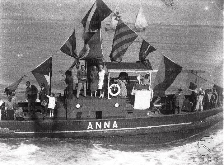 Scorcio dall'alto dell'imbarcazione "Anna" con numerose persone, donne uomini e ragazzi in abiti borghesi, a bordo