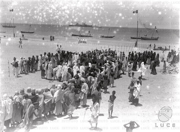 Una folla di uomini e donne somali č radunata su una spiaggia; in mare si scorgono diverse imbarcazioni - campo lungo con scorcio dall'alto