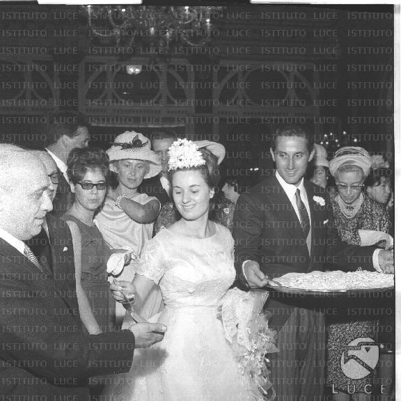 Gli sposi, Marina Fanfani e il marito Londei dsitribuiscono agli invitati i confetti; sulla sinistra c'č Fanfani - piano americano