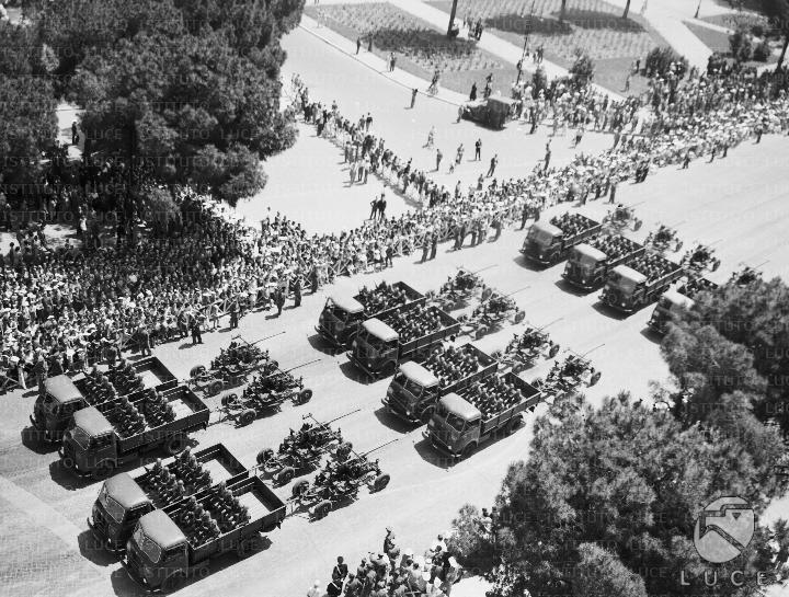 • descrizione Autocarri, carichi di soldati, che trainano pezzi di artiglieria su ruote, sfilano, tra ali di folla, nel tratto del viale ai piedi dell'Altare della Patria