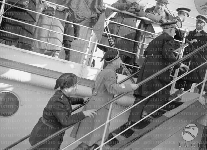 Thaon di Revel (parzialmente di spalle) ed altre persone salgono per una scaletta verso il ponte superiore del Rex in occasione delle esercitazioni navali nelle acque del golfo di Napoli